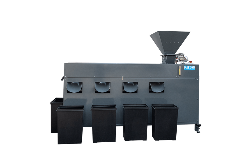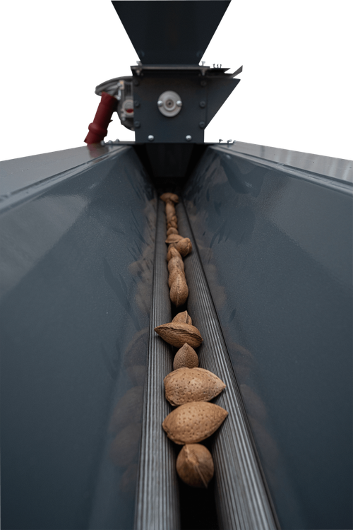 2. **عبور از غلطکهای تنظیمشده:** بادامها روی **غلطکهای چرخان** حرکت میکنند که بر اساس اندازه و وزن، آنها را دستهبندی میکنند.